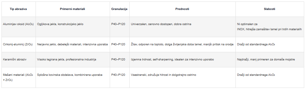 Nekateri lamelni diski vsebujejo mešanico Al₂O₃ in ZrO₂, kar omogoča vsestransko rabo in dobro razmerje med hitrostjo brušenja in življenjsko dobo.