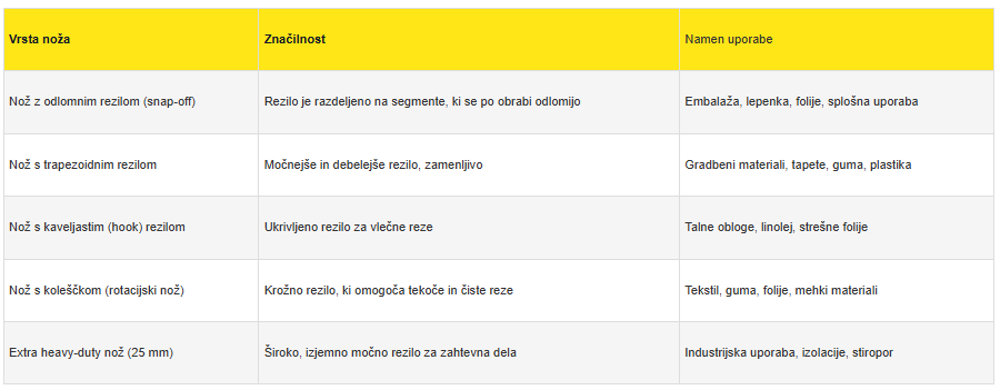 Za profesionalne uporabnike je univerzalni nož osnovno ročno orodje, ki mora združevati natančnost, vzdržljivost in varnost. Pogosto ga poznamo tudi pod imeni nož za lepenko, olfa nož ali preprosto delovni nož.