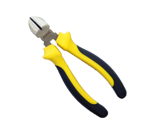 In English, these are known as diagonal pliers, diagonal cutters, or side cutters. Electricians in the U.S. often call them dikes or diags in slang, though these terms are less formal. They are designed to cut wire and other materials, with blades set diagonally to the handles. The tool became essential during the late 19th century, especially with the rise of electrification and fencing.